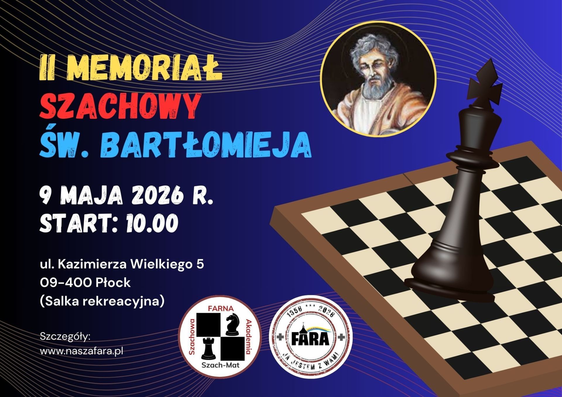 Farna Akademia Szachowa „Szach-Mat” zaprasza na II Memoriał szachowy św. Bartłomieja, który odbędzie się w sobotę 9 maja 2026 r. od godz. 10.00. Memoriał będzie miał miejsce w Domu Parafialnym przy ul. Kazimierza Wielkiego 5 w Płocku.
