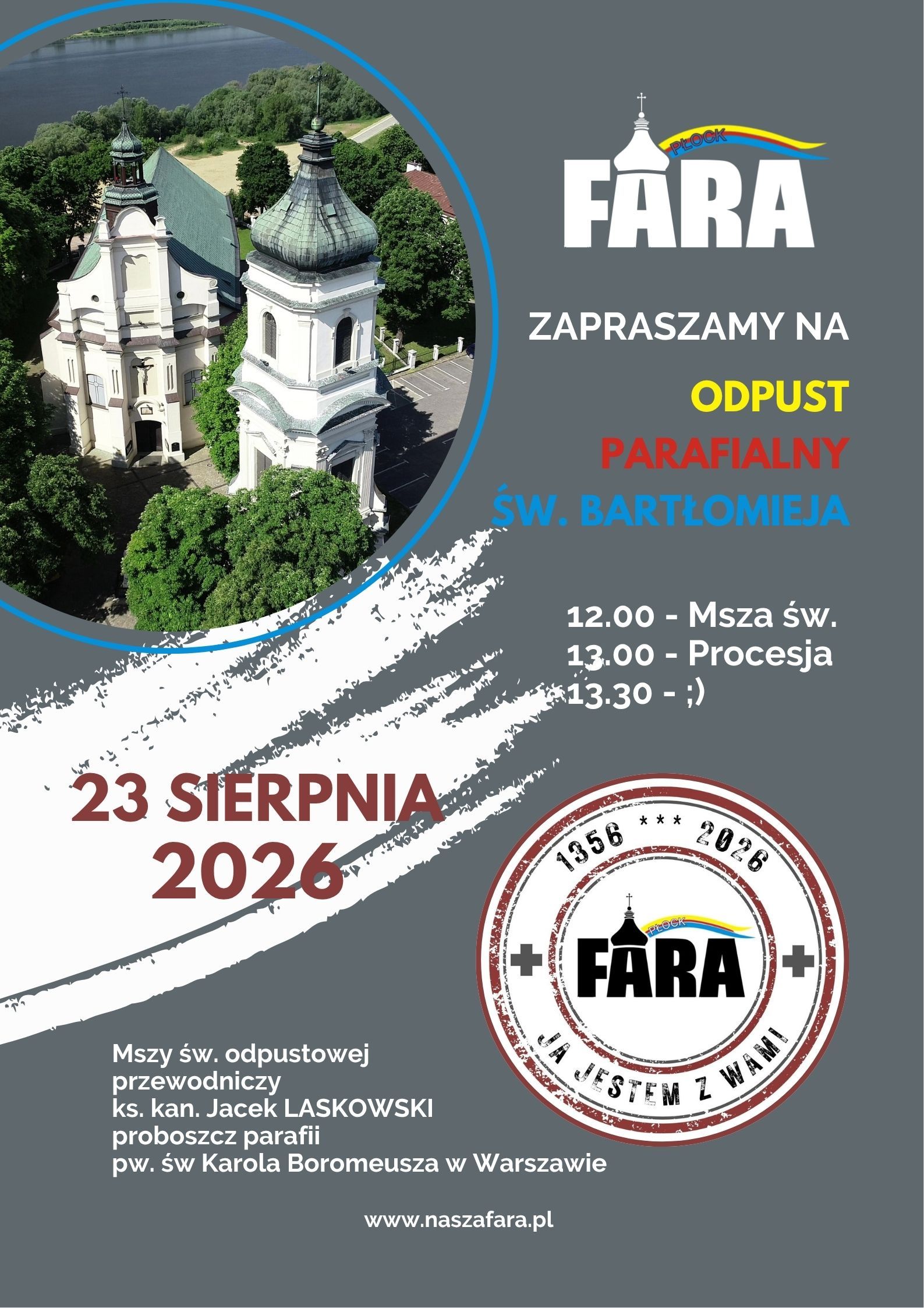 Serdecznie zapraszamy na odpust parafialny ku czci św. Bartłomieja Apostoła, który odbędzie się w niedzielę, 23 sierpnia 2026 r. w Płockiej Farze. Mszy św. odpustowej będzie przewodniczył ks. kan. Jacek Laskowski, proboszcz parafii pw. św. Karola Boromeusza w Warszawie (Stare Powązki).